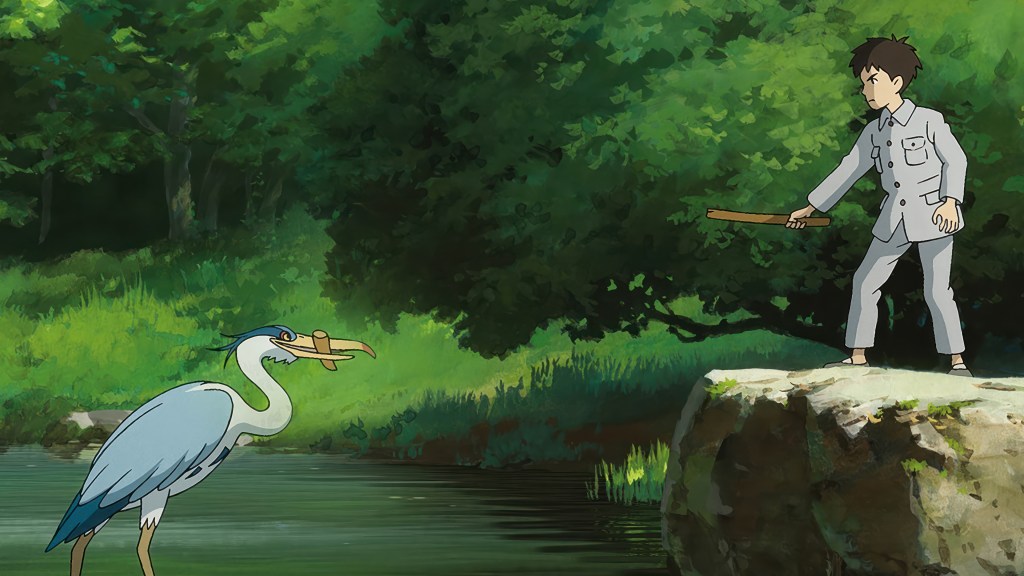 So before going forward I feel like I should mention that I watched the dubbed version of the film rather than the subtitled version. This isn’t something I would normally do, but sweet Jesus, with a cast like this, how could I possibly pass that up. Studio Ghibli isn’t a stranger to landing some big names for their films; just look at Christian Bale and Billy Crystal in Howl’s Moving Castle. Here you’ve got Florence Pugh as the no-nonsense fisherman Kiriko, Christian Bale as the well-meaning but absent minded father Shoichi, Dave Bautista as the hot-headed Parakeet King, and even Willem DaFoe as a dying pelican for a full minute. But the biggest voice role I want to talk about here, mostly because of how batshit weird it is, is Robert Pattinson as the Heron. Genuinely and unequivocally unrecognizable. If I hadn’t known this was Pattinson before going into this film, I could not have guessed. Pattinson is such a grimy little troll of a character, being both snarky and pathetic when it’s called for. He is fully losing himself in this character, and was easily the highlight of the film whenever he gets to be on screen.