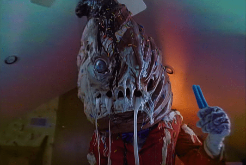 What cannot be disputed is the visual beauty of this film. The way colors are utilized so vibrantly is so alluring, mesmerizing, and at times, haunting. From hot pinks to cool blues, this film radiates a bygone era of glow in the dark chalk and tv static. This is one of the best replications of the 90s aesthetics I’ve seen, and nowhere is that more apparent than the Pink Opaque show. A callback to programs like Buffy the Vampire Slayer and Are You Afraid of the Dark, everything from the creature designs to the teen melodrama is expertly recreated. Even though the film pulls a lot of dread from small town suburbia, there’s still an undeniable nostalgia to its cineplexes and dial controlled televisions. But one person’s nostalgia is another person’s nightmare, and there’s plenty of nightmare fuel to be found here. While not presenting as a traditional, upfront horror film, there are still plenty of scenes that are genuinely unnerving and even difficult to watch. Similarly to World’s Fair, the use of horror here is unique and goes beyond a simple intention to shock. It tears at you emotionally, realizing trauma and suffering in an empathizing and effective way. The big one for me was a scene involving a head going through a TV. It made me want to vomit, but not in the visually grotesque way you might be thinking.