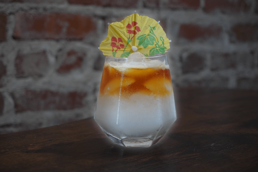 - Slowly pour the dark rum over the back of a spoon over the drink to create the layer effect.